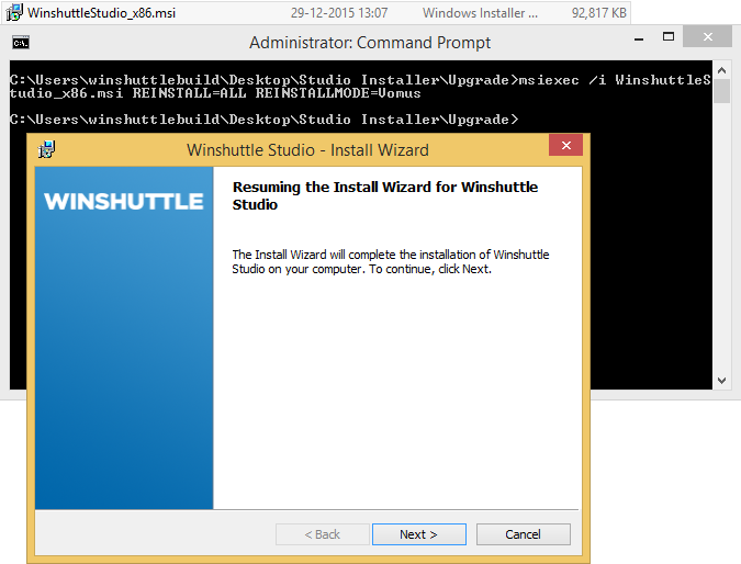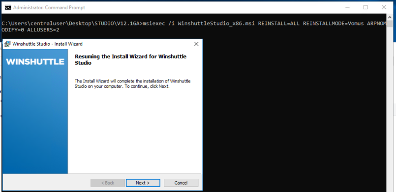 msiexec /i WinshuttleStudio_x86.msi REINSTALL=ALL REINSTALLMODE=Vomus ARPNOMODIFY=0 ALLUSERS=2