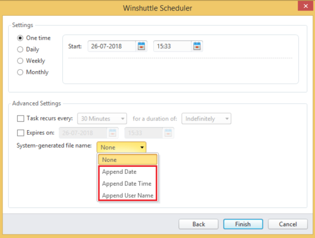 7. Click One time, Daily, Weekly, or Monthly.
