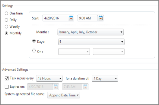 9. Under Advanced Settings, you can choose to run the script multiple times. For example, if you want to run the script monthly on the fifth day, and you want to run the script at the beginning and the end of the day, check the Task recurs every box, click 12 Hours, and click 1 Day.