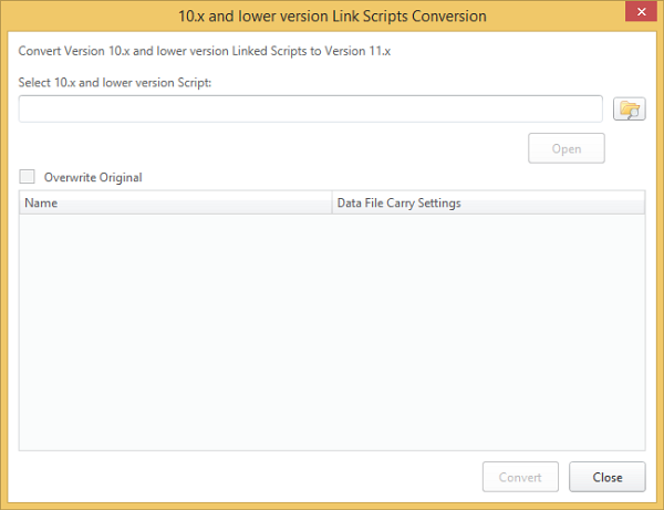 Convert script chains that were created in v10.x to the v11 and later format. The chained scripts will be created in the same folder and have the extension _v11 (or _v12 or later version), unless you check the Overwrite original box.