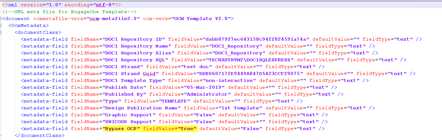 Publishing in this way results in a ZIP file containing resources required when importing your template in EngageOne Admin. The ZIP file contains a template_Master.xml file which holds configuration information. An Express Batch compatible template will have its Bypass OCP field set to true as highlighted below.