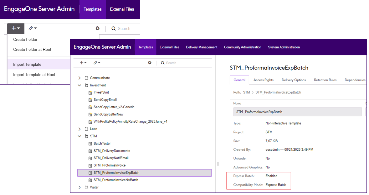 If your template is correctly configured in Designer, the Express Batch and Compatibility Mode fields are set to Enabled and Express Batch respectively.