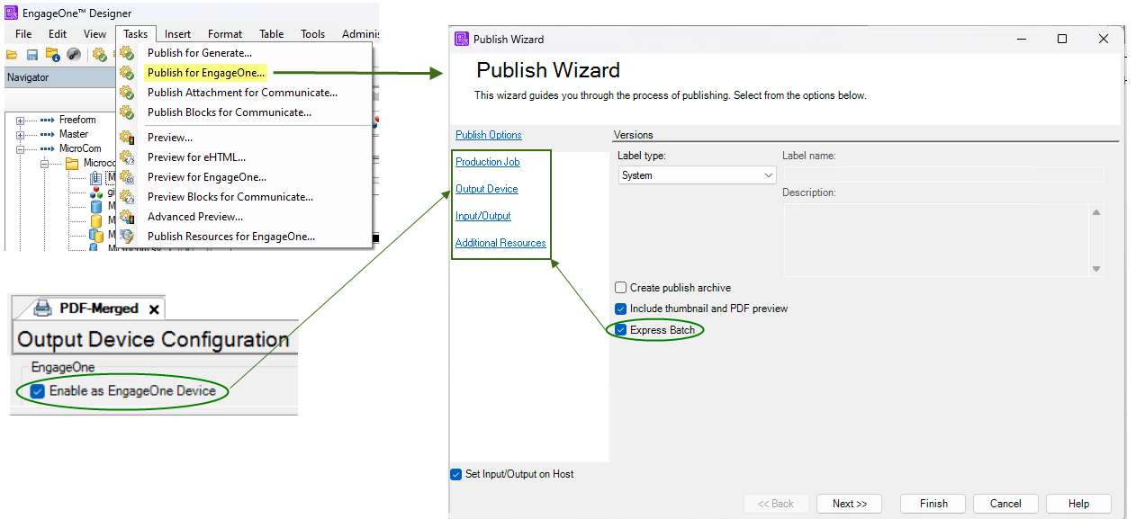 When publishing non-interactive templates, if you want to use the Express Batch document composition route, use the option Publish to EngageOne, this launches the Publish Wizard, select the Express Batch option, as shown below.