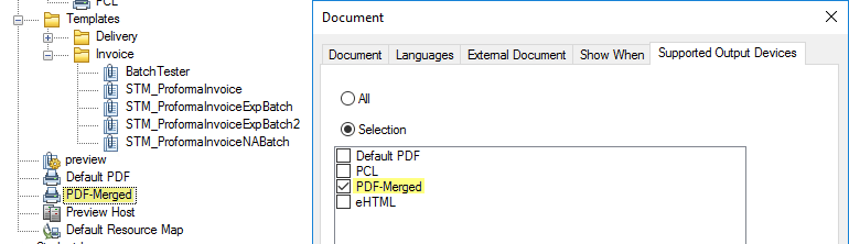 - PDF-Merged must be the same name as the output device name defined in Designer