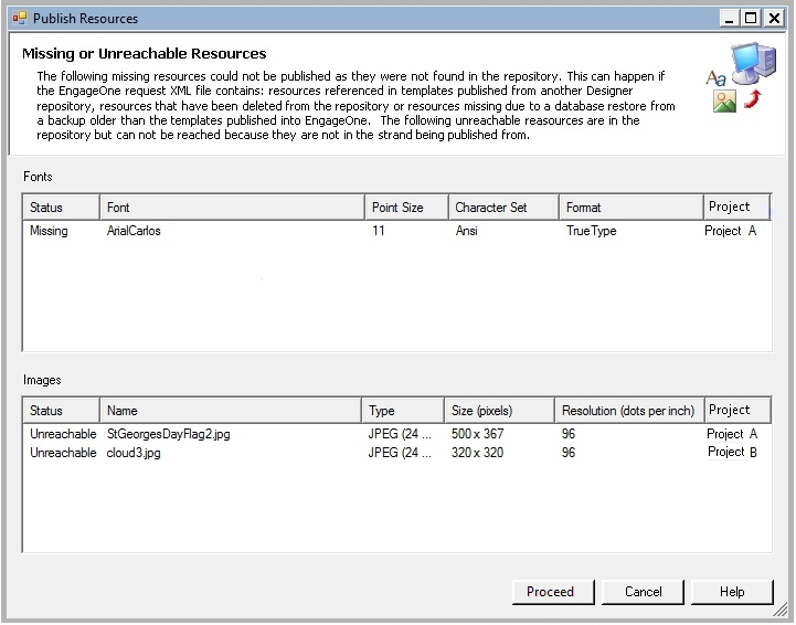 If a resource cannot be found, you must resolve them and then rerun the publishing process. The Missing Resources dialog box lists all the fonts and images that cannot be found in the EngageOne™ Designer repository but are present in the resource request file.