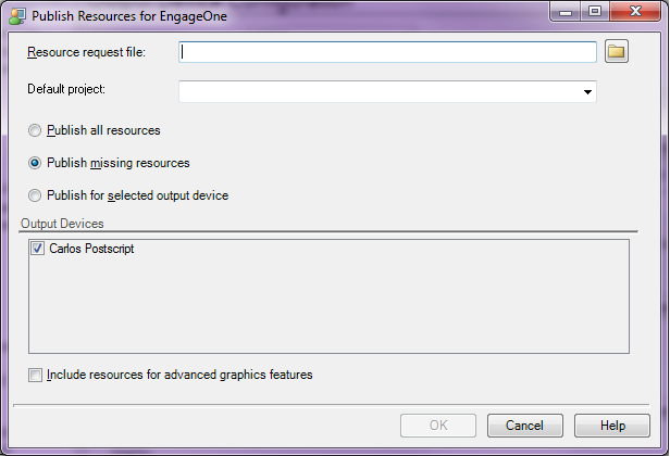 - Publish all resources: publish all of the resources requested in the EngageOne™ resource list for all of the output devices in the EngageOne™ resource list.