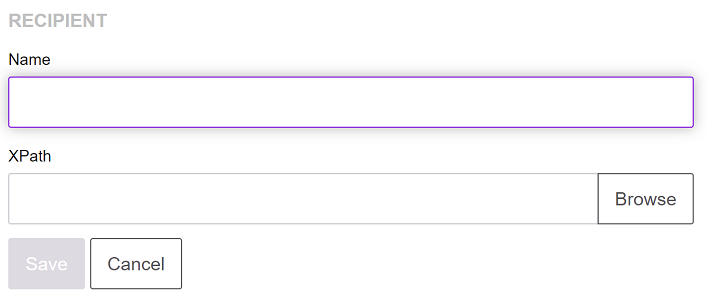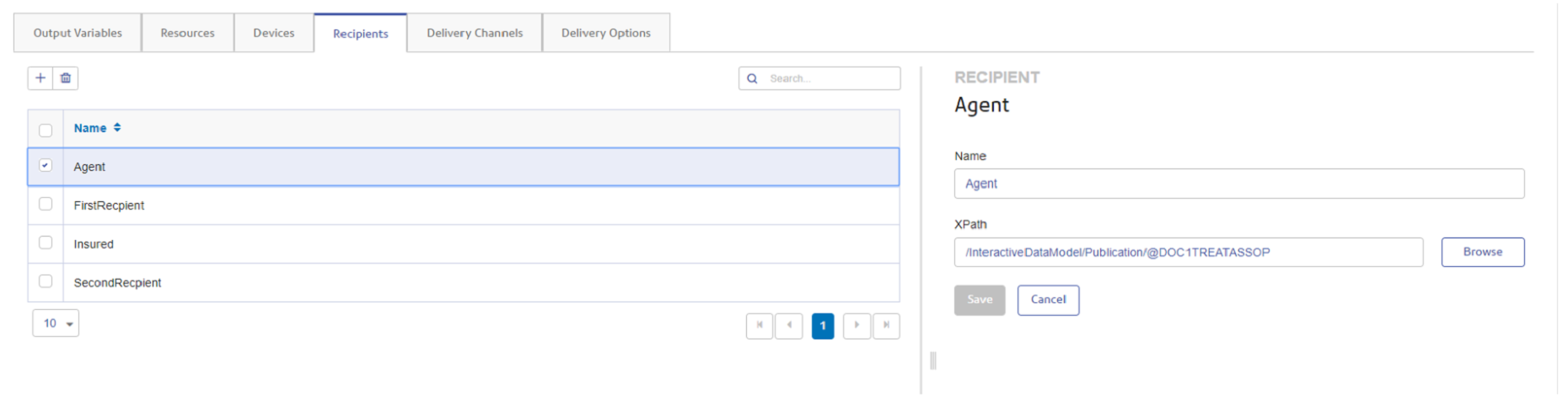In order for the recipient processing to work, the recipients must be defined in EngageOne Administration after you define the recipient condition in Designer. The Recipient tab XPath field corresponds to the recipient data field defined in the EngageOne™ Designer document logic, as shown in the next task.