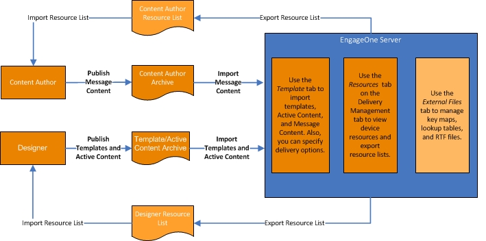 Resource management requires coordination of the fonts and images used by templates, devices, Active Content, and Message Content. Templates, devices, and Active Content are defined in EngageOne™ Designer. Message Content is defined in Content Author. This section explains how to manage these resources effectively. The following diagram shows the resource workflow among EngageOne™ Designer, EngageOne™ EngageOne™ Content Author, and EngageOne™.