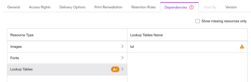 - Resolve missing resources by exporting the resource list to EngageOne™ Designer and re-importing the template into EngageOne™ Administration. For more information, see Exporting resources and the EngageOne™ Designer User’s Guide.