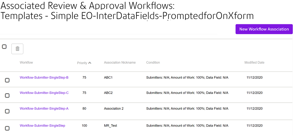 - Click New Workflow Association to create a new workflow association. Refer to Associating a workflow to your template for further information.