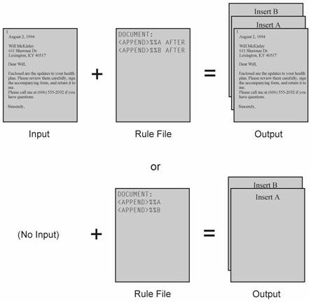 - Use <APPEND> commands in the rule file to designate which inserts to add and where to add them. The order in which Enrichment executes the <APPEND> commands in the rule file determines the order in which it assembles the documents.