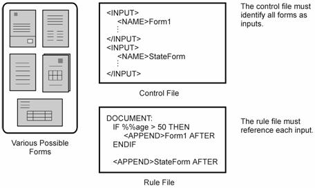 - Use <APPEND> commands in the rule file to designate which insert pages to append and where to append them. The order in which Enrichment executes the <APPEND> commands in the rule file determines the order in which it assembles the insert pages.