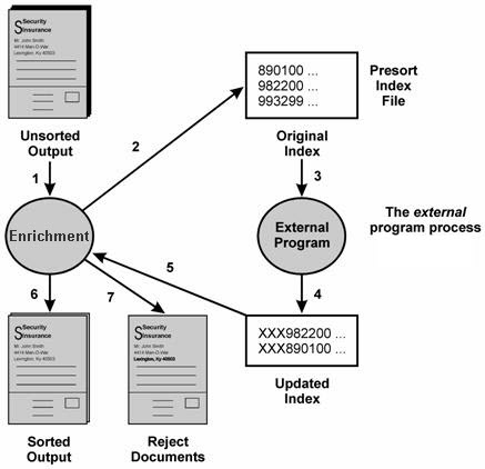 Presorting effectively allows Enrichment users to change the order of documents in the print stream and optionally exclude certain documents. The external programs that Enrichment calls can be postal sorting programs or any other type of program that can manipulate an index.