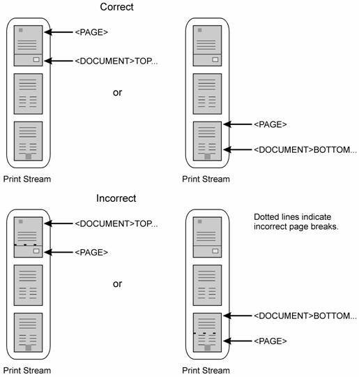 • The first <PAGE> tag location (or the first automatic page break) must occur on the first record of the first document in the print stream.