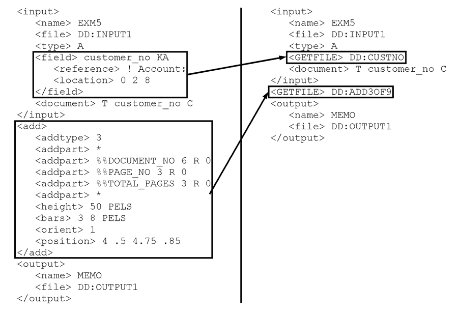 The following diagrams illustrate how you can use <GETFILE> to share code that defines a field and adds a 3of9 barcode.