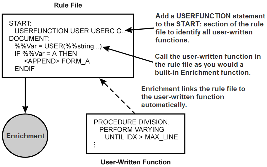 In addition to the functions built into Enrichment, you can write or use existing subroutines within rule files as functions. These functions can be written in COBOL, Assembler, or C. You identify the user-written subroutine for use within the rule file by adding the USERFUNCTION declaration in that file. Once you define a function, you can use it in the same manner as any other Enrichment function.