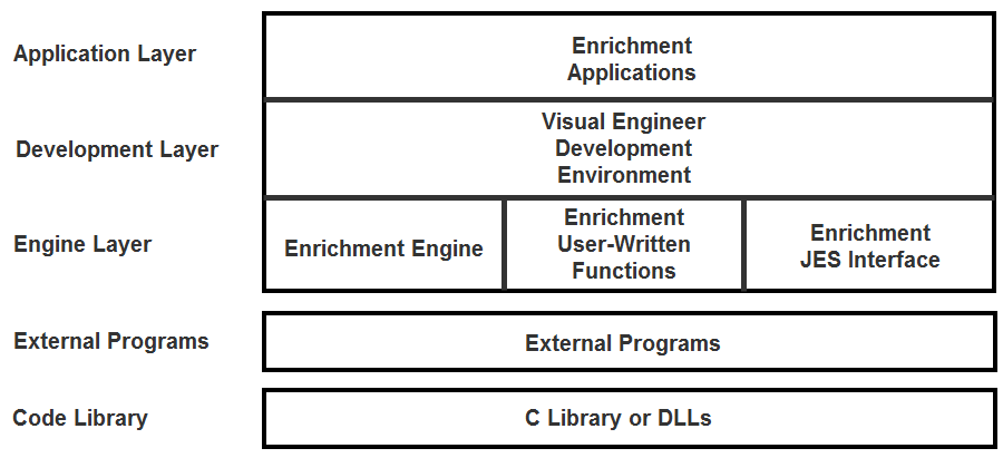 The C library (for mainframe systems or UNIX) or DLLs (for Windows) serve as the code library accessed by the Enrichment engine when running applications. Depending on the platform, various libraries may be required.