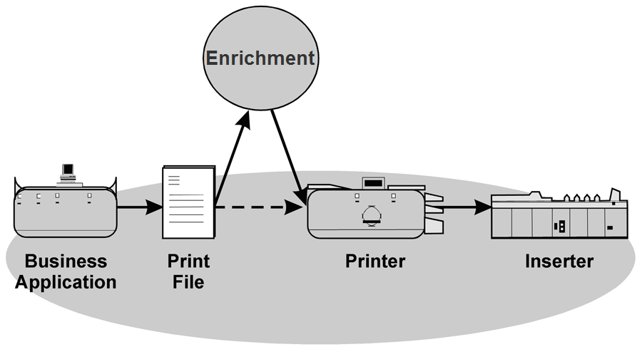 With Enrichment, your business application creates a print file that you run through Enrichment for the appropriate enhancements. The enhanced output prints and runs through the inserter.