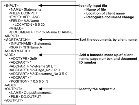 To define an object in Enrichment you use a tag group. The example below shows code from a control file. In the example, an input print stream object is defined using an Input tag group (<INPUT> and </INPUT>), and a data item object from the print stream is defined using a Field tag group (<FIELD> and </FIELD>) that is nested in the Input tag group. When you code a tag group, you are telling Enrichment to create and process the associated object.