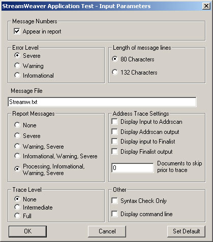To launch Application Test, select Code > Launch Enrichment Engine. The Enrichment Application Test - Input Parameters window appears. This window allows you to specify options for messages, traces, and other run-time settings.