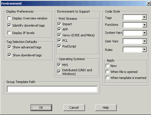 The Environment window lets you change global settings related to the operating environment and appearance. To access this window, open a control file and then select Options > Environment.