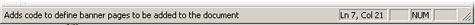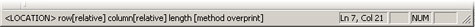 When your cursor is on a tag in the editing window, the status bar (as shown below) displays the name of the tag and its parameters, the line number, the column number, and whether or not CAPS LOCK, NUM LOCK and Overprint are on.