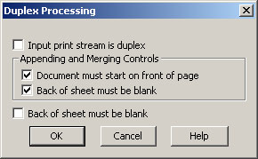 The Duplex Processing window lets you define duplex options and control how objects are appended to or merged with this print stream. To access this window, open a print stream, select File > Print Stream Properties, and then click Duplex Processing.