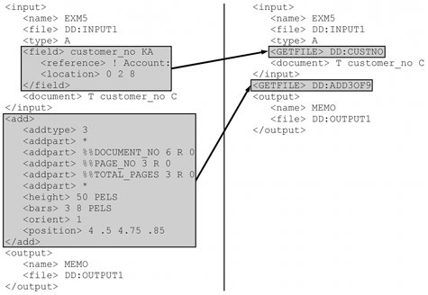 For example, the left-hand portion of the figure shows a fully tagged control file. Assume that the Field tag group and Add tag group are used identically in several Enrichment applications. If this is the case, it might save application development time (and troubleshooting time) to place these common structures in separate files to be called in Enrichment applications by <GETFILE> statements, as shown in the right-hand portion of the figure. The file at DD:CUSTNO contains only the Field group tagging, exactly as it would be presented in a complete control file, including comments. Likewise, the file at DD:ADD3OF9 contains only the Add group tagging.