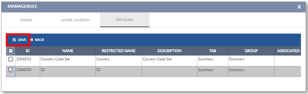 To assign the attributes that will use the validation rule, select the Attributes tab on the Manage Rule editor’s Page Bar. The Attributes page will open.