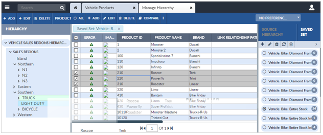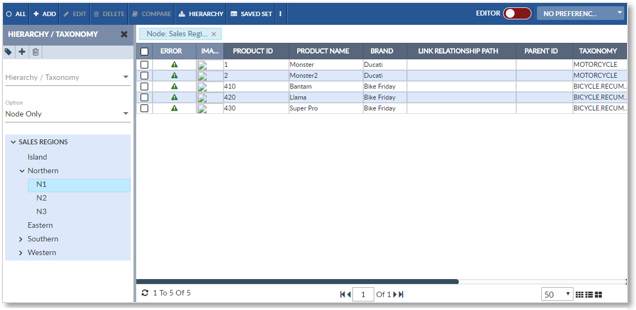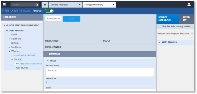 - Toggle the Product toggle to On (it will be green). The Current Hierarchy Node Tree will display the records