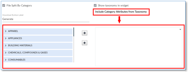 - Show Taxonomy in Widget: If selected, the Include Category Attributes fromTaxonomy Node selection panel will appear on the widget and the user will be able to select which category attributes to include in the generated file. If it is not checked, the user will not be able to change the list of category attributes to be included in the file.