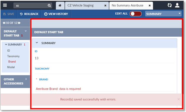 The Attribute List notes any errors or warnings the record may have, by highlighting affected attributes in red. The Attribute Groups and Attribute Tabs display a count of their attribute values with errors (in red) and warnings (in yellow). Hovering over an affected attribute will cause its error or warning message to display.