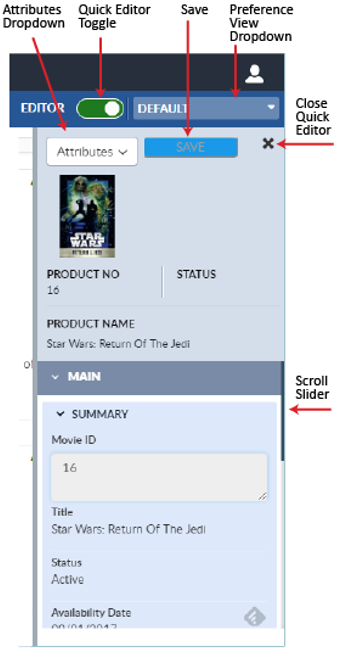 The attribute list can be scrolled by using the scroll slider bar on the right of the Inline Editor window. Alternatively, the user may select the Attribute dropdown list in the Inline Editor’s Activity Bar and select an attribute. The Inline Editor will scroll to display that attribute.