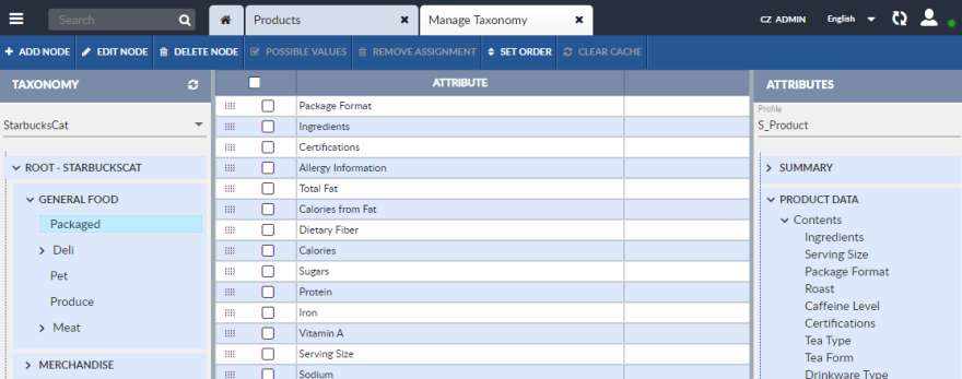 The right pane of the Taxonomy Manager is the Available Category Attributes pane. It displays the Category Attributes that can be assigned to Taxonomy nodes. The attributes are organized by Attribute Tabs and Attribute Groups.