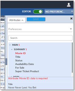 Preferences may be selected while the Inline Editor is active. Selecting the Attribute dropdown list allows the user to select a Preference or perform a Basic Text Search.