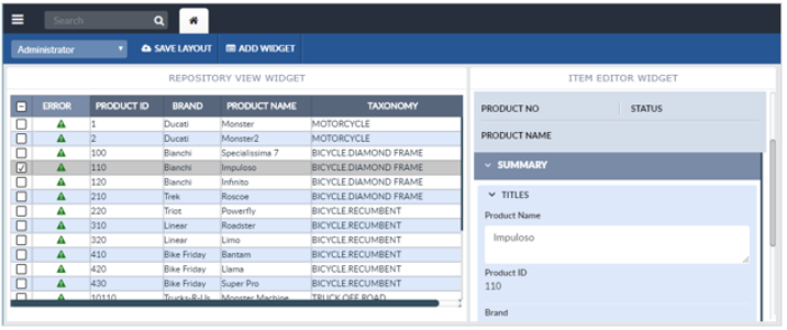 The Item Editor widget allows you to edit a record selected in the Repository View widget. If both are present on the dashboard, when you select a record in the Repository View widget, the record will appear in the Item Editor widget. The record will be opened in either a Detail Editor format or a Inline Editor format, depending on the configuration of the Item Editor widget.