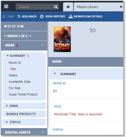 The Attribute List notes any errors or warnings the record may have, by highlighting affected attributes in red. The Attribute Groups and Attribute Tabs display a count of their attribute values with errors (in red) and warnings (in yellow). Hovering over an affected attribute will cause its error or warning message to display.