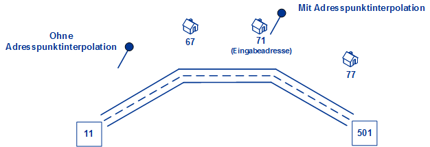 In der folgenden Abbildung wird die Funktionsweise der Adresspunktinterpolation dargestellt. Im Beispiel lautet die eingegebene Hausnummer 71. Im Geocoding-Dataset sind Adresspunkte für 67 und 77 enthalten. Das Straßensegment hat einen Bereich zwischen 11 und 501. Bei der Adresspunktinterpolation führt Global Geocoding-REST-API die Interpolation für die eingegebene Hausnummer 71 mithilfe der Punkte 67 und 77 durch. Ohne die Adresspunktinterpolation erfolgt die Interpolation durch Global Geocoding-REST-API mit den Straßensegmentendpunkten 11 und 501, sodass ein sehr viel ungenaueres Ergebnis erzielt wird.