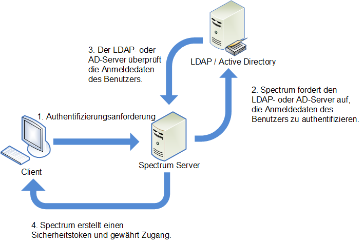 Sie können Spectrum™ Technology Platform konfigurieren, einen LDAP- oder Active Directory-Server zur Authentifizierung zu verwenden. Wenn sich ein Benutzer bei Spectrum™ Technology Platform anmeldet, werden die Anmeldeinformationen des Benutzers unter Verwendung von LDAP oder AD verifiziert. Das System überprüft dann, ob ein Spectrum™ Technology Platform-Benutzer mit demselben Namen vorhanden ist. Wenn das der Fall ist, wird der Benutzer angemeldet. Andernfalls wird automatisch ein Spectrum™ Technology Platform-Benutzerkonto für den Benutzer erstellt.