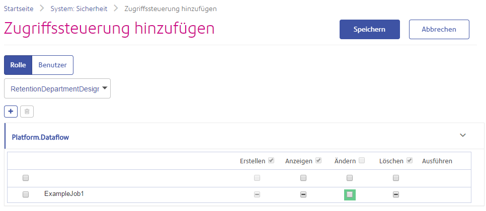 In diesem Beispiel ist der gesicherte Entitätstyp „Plattform.Datenfluss“ so festgelegt, dass die Berechtigungen zum Anzeigen und Ändern erteilt werden, die Berechtigung zum Löschen jedoch nicht. Folglich würde jeder Benutzer mit der Rolle „RetentionDepartmentDesigner“ für alle Datenflüsse über diese Berechtigungen verfügen. Sie möchten jedoch verhindern, dass Benutzer mit dieser Rolle nur den Datenfluss „Beispielauftrag 1“ ändern können. In diesem Fall müssen Sie das Kästchen bei „Beispielauftrag 1“ in der Spalte „Ändern“ deaktivieren. Jetzt können Benutzer mit dieser Rolle diesen Datenfluss nicht ändern, sie können aber weiterhin andere Datenflüsse ändern.