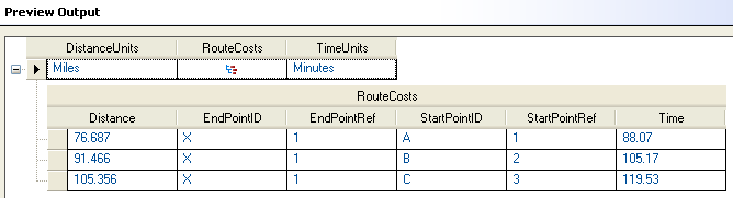Die folgende Beispielausgabe zeigt, dass die in der Beispieleingabe zugewiesenen StartPointIDs (bei Eingabe als „A“, „B“ und „C“ bezeichnet) den ersten drei Einträgen in der Liste der Punkte (von Spectrum™ Technology Platform als „1“, „2“ bzw. „3“ nummeriert) entsprechen. Sie zeigt außerdem, dass die erste EndPointID (bei Eingabe als „X“ bezeichnet) die effizienteste Route von allen drei StartPointIDs ist, verglichen mit den anderen beiden EndPointIDs (bei Eingabe als „Y“ und „Z“ bezeichnet, werden unten nicht angezeigt, weil EndPointID „X“ die effizientere Route ist).