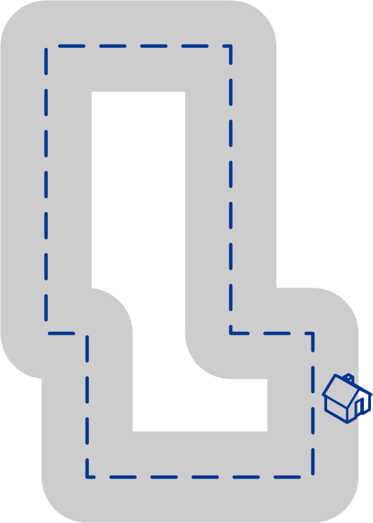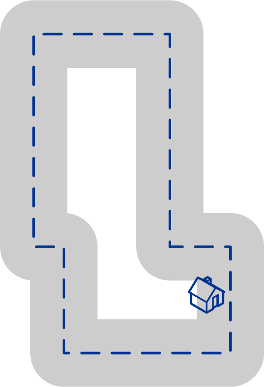 Wenn Sie beispielsweise für eine Versicherungsgesellschaft arbeiten, möchten Sie vielleicht wissen, ob sich das Haus eines potenziellen Kunden innerhalb von 150 Metern um ein Überschwemmungsgebiet befindet, damit Sie ihm eine Versicherung gegen Überschwemmungen vorschlagen können, auch wenn er sich nicht direkt innerhalb eines Überschwemmungsgebiets befindet. Die folgende Abbildung zeigt dieses Szenario mithilfe eines gepufferten Polygons. Die gepunktete Linie zeigt die Begrenzung des Überschwemmungsgebiets an, der schattierte Bereich zeigt eine Pufferzone von 150 Metern um die Begrenzung an.