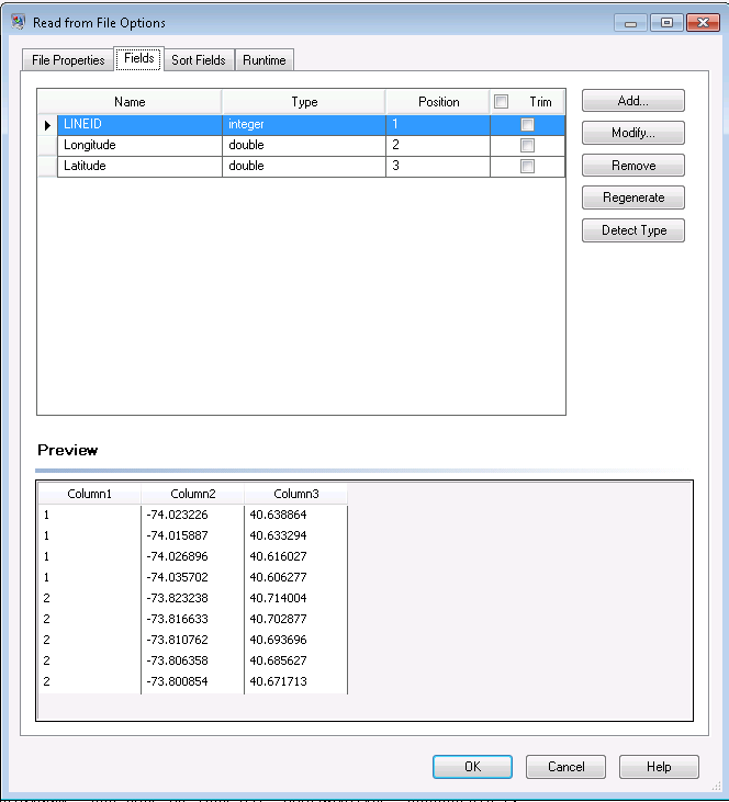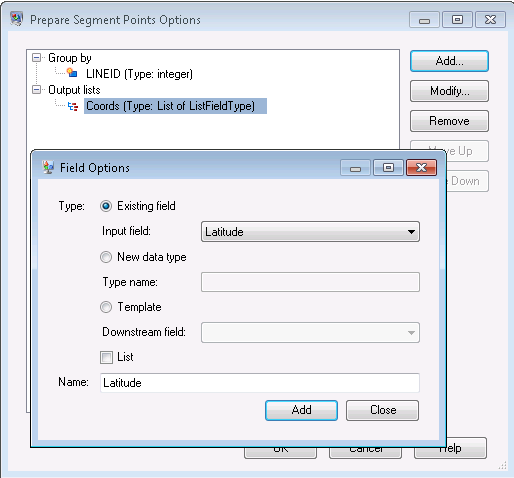 Hier besteht die Eingabe für den Aggregator aus einer Reihe von Längengraden und Breitengraden, die mindestens eine Linie definieren. Bei dem erstellten Schema handelt es sich um eine Liste mit , in der die Koordinatenfelder beschrieben werden. Wenn Ihre Koordinaten Polygone (geschlossene Zeilensegmente) darstellen, kann es auch zur Erstellung einer Liste mit verwendet werden. Die ausgegebenen Segmentpunkte werden anschließend als Eingabe für einen Vorgang zum Erstellen einer Liniengeometrie mit dem Spatial Calculator verwendet.