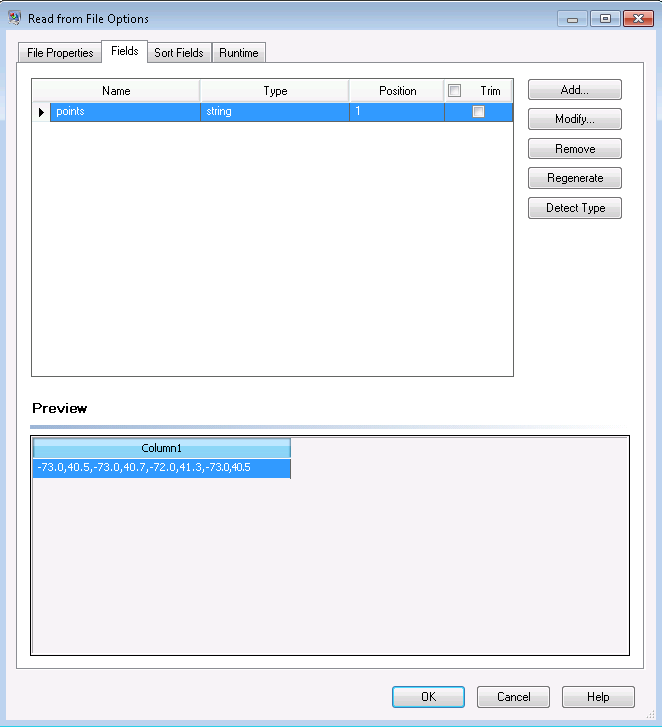 Hier stellt ein Zeichenfolgenfeld mit Breitengrad/Längengrad-Standorten in einer Zeile die Eingabe für den Transformer dar (x1,y1,x2,y2,x3,y3...). Ein -Feld stellt die Ausgabe dar. Damit kann auch ein -Feld für Polygone ohne Löcher erstellt werden.