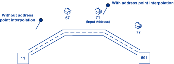 La siguiente ilustración muestra el funcionamiento de la interpolación de punto de dirección. En el ejemplo, el número de casa de entrada es 71. El conjunto de datos de geocodificación contiene puntos de dirección para 67 y 77. El segmento de calle tiene un rango entre 11 a 501. Con la interpolación de punto de dirección, API de Global Geocoding REST realiza la interpolación del número de casa de entrada 71, usando los puntos de 67 y 77. Sin la interpolación de punto de dirección, API de Global Geocoding REST realiza la interpolación con los puntos finales del segmento de calle de 11 y 501, y produce un resultado que es mucho menos preciso.
