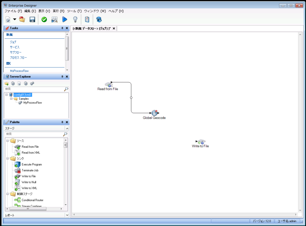 データベース リソース変更後のジオコーディング データフローのリセット 確立されているデータフローがあり、その後、ジオコーディング データセットの追加または削除によってデータベース リソースを変更した場合は、Enterprise Designer を終了して再起動するか、データフローをリセットするために次の手順を実行する必要があります。 Enterprise Designer のジオコーディング データフローで、グローバル ジオコードまたはグローバル リバース ジオコード ステージと出力ステージとの間の出力ポート チャネルを選択します。次の例では、[Write to File] ステージが出力ステージになっています。 チャネルを削除します。 グローバル ジオコードまたはグローバル リバース ジオコード ステージ上の出力ポートを出力ステージに再接続します。 データフローを保存します。 データフローはリセットされ、設定および実行する準備が整います。