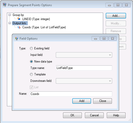 出力用に新しいデータ タイプを作成する場合は、 フィールドを強調表示し、[追加] をクリックします。[フィールド オプション] ダイアログ ボックスで、[新規] データ タイプを選択し、タイプ名として "ListFieldType" と入力します。[名前] フィールドで、"Coords" と入力します。[追加] をクリックし、[閉じる] をクリックします。