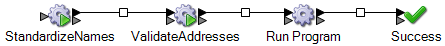 例えば、このプロセス フローには、2 つのジョブ ("Standardize Names" と "Validate Addresses") と 1 つのプログラムの実行アクティビティが含まれています。このプロセス フローの最後は成功アクティビティです。