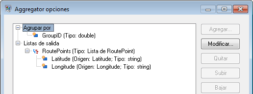 - La etapa Aggregator establece que los datos deben estar agrupados por el campo GroupID y que las listas de salida deben incluir Puntos de ruta elaborados a partir de latitudes y longitudes. Las siguientes instrucciones muestran cómo configurar manualmente la etapa Aggregator para este flujo de datos: