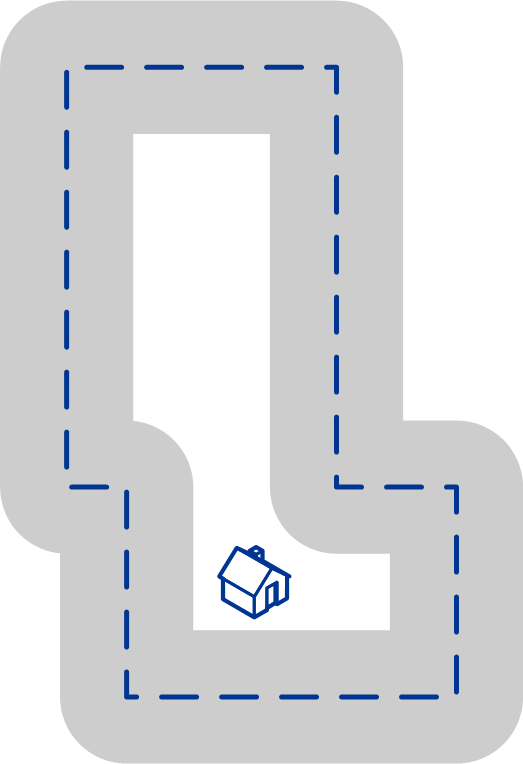 Por ejemplo, una persona que trabaja para una compañía de seguros puede querer saber si la casa de un potencial cliente se encuentra a menos de 150 metros de una zona inundable para poder ofrecerle un seguro contra inundaciones aunque la casa del potencial cliente no se encuentre exactamente dentro de la zona inundable. La siguiente ilustración muestra esta situación hipotética utilizando un polígono de influencia. La línea punteada indica el límite de la zona inundable y el área sombreada muestra un área de influencia de 150 metros alrededor del límite.